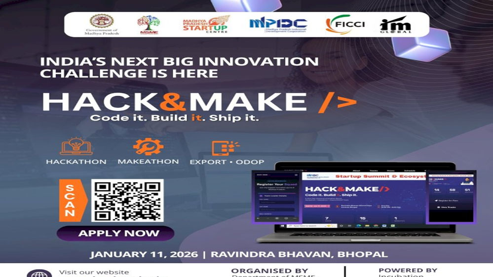 भोपाल में ‘हैक & मेक’ 2026 का आयोजन भोपाल के जहांनुमा पैलेस होटल में 11-12 जनवरी को किया जायेगा। भारत की पहली राज्य-स्तरीय ट्राई-ट्रैक नवाचार का यह अभिनव आयोजन सॉफ्टवेयर विकास, हार्डवेयर प्रोटोटाइपिंग और निर्यात–व्यापार समाधान के क्षेत्रों में एक साथ क्रियान्वयन-आधारित नवाचार को बढ़ावा देगा। मध्यप्रदेश शासन की यह पहल पारंपरिक हैकथॉन से आगे बढ़ते हुए प्रतिभागियों के समक्ष कार्यान्वयन-केन्द्रित मॉडल बनाने की चुनौती प्रस्तुत करती है। प्रतियोगिता में चयनित सॉल्युशंस को वास्तविक धरातल पर लागू करने के लिये अवसर उपलब्ध कराए जायेंगे।