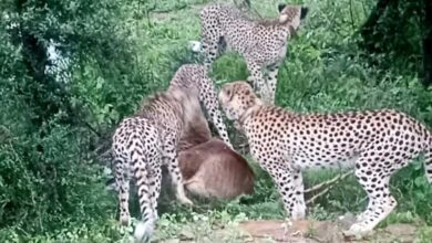 मादा चीता ज्वाला अपने तीन शावकों के साथ विजयपुर क्षेत्र के गसवानी के पास बारिश के बीच देखी गई