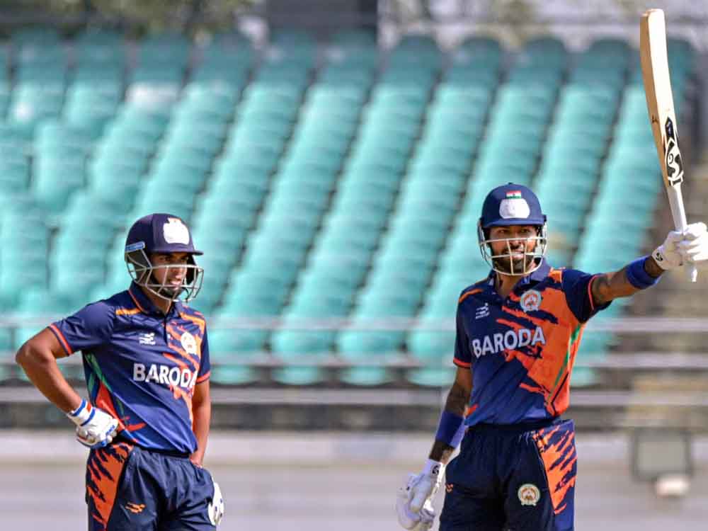 हार्दिक पांड्या ने तीन विकेट लिए, और उन्होंने अपने 10 ओवर पूरे किए। बड़ौदा ने 149 रनों से शानदार जीत हासिल की।