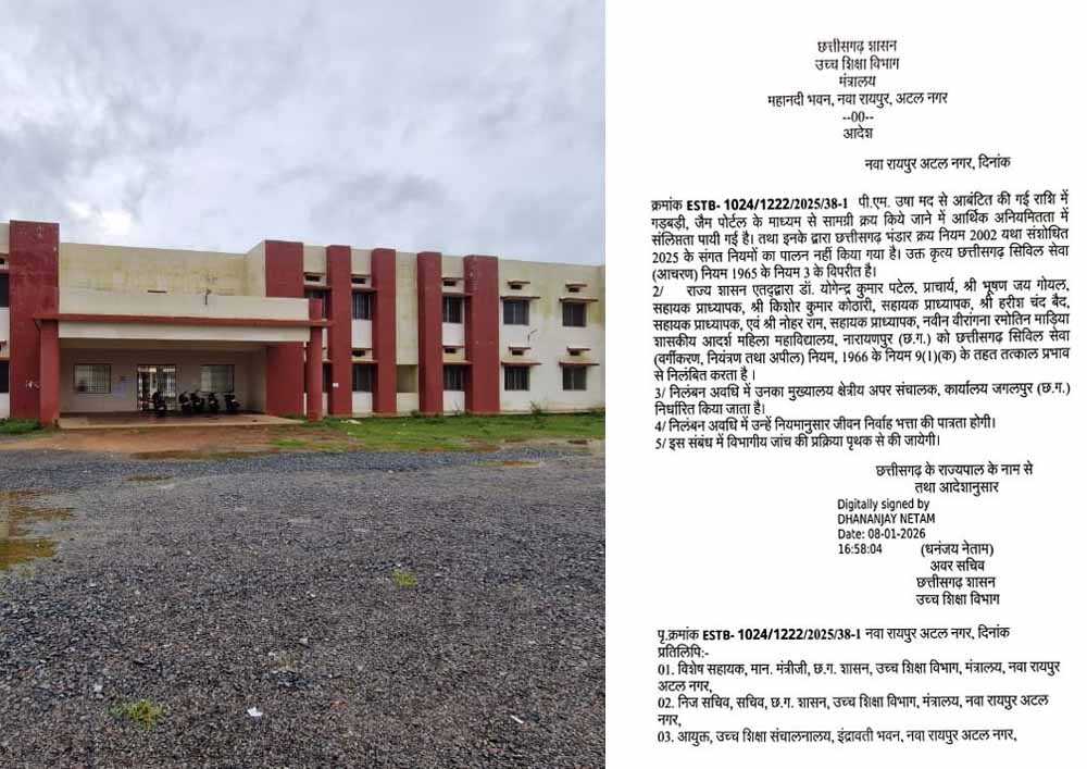 जारी आदेश के अनुसार सामग्री क्रय में गड़बड़ी, प्रक्रियागत अनियमितता एवं छत्तीसगढ़ वित्तीय नियम संहिता 2002 (संशोधित 2025) के उल्लंघन की पुष्टि प्रथम दृष्टया होने पर यह निर्णय लिया गया। इसके तहत महाविद्यालय के प्राचार्य डॉ.योगेंद्र पटेल,सहायक प्राध्यापक भूषण जय गोयल, किशोर कुमार कोठारी, हरीश चंद बैद एवं नोहर राम के नाम शामिल हैं। निलंबन आदेश के तहत सभी संबंधित अधिकारियों को छत्तीसगढ़ सिविल सेवा (वर्गीकरण, नियंत्रण तथा अपील) नियम 1966 के नियम 9(1)(क) के अंतर्गत तत्काल प्रभाव से निलंबित किया गया है। निलंबन अवधि के दौरान उनका मुख्यालय क्षेत्रीय अपर संचालक, कार्यालय जगदलपुर (छ.ग.) निर्धारित किया गया है तथा उन्हें नियमानुसार जीवन निर्वाह भत्ते की पात्रता होगी।