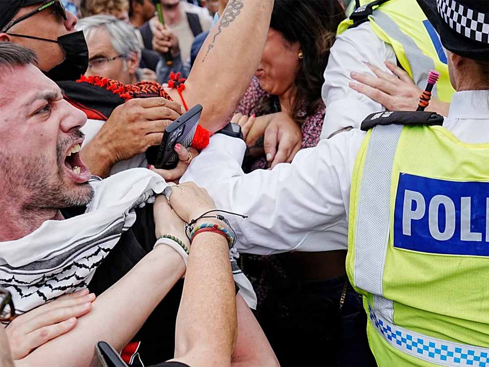 विरोध प्रदर्शन का आयोजन करने वाले समूह डिफेंड अवर ज्यूरीज ने कहा कि लंदन में प्रदर्शन में 1500 लोग शामिल हुए। उन्होंने ‘मैं नरसंहार का विरोध करता हूं, मैं फिलिस्तीनी कार्रवाई का समर्थन करता हूं’ जैसे नारे लिखे हुए पोस्टर लिए हुए थे। कुछ ही मिनटों में पुलिस ने प्रदर्शनकारियों को गिरफ्तार करना शुरू कर दिया, जबकि राहगीर ‘शर्म करो’ और ‘मेट पुलिस, एक पक्ष चुनो, न्याय या नरसंहार’ के नारे लगा रहे थे।