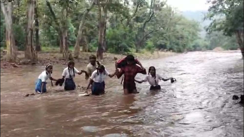 तेज बारिश के कारण नदी का जलस्तर बढ़ने से बच्चे घंटों तक नदी किनारे फंसे रहे. बारिश में भीगते हुए खड़े मासूम बच्चों को देखकर गांव के कुछ ग्रामीणों ने अपनी जान की परवाह न करते हुए बारी-बारी से उन्हें नदी पार कराया.