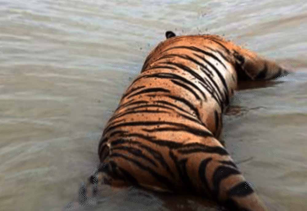 मध्य प्रदेश के नर्मदापुरम जिले में तवा नदी के किनारे बढ़ चापड़ा गांव के करीब शुक्रवार को एक बाघ का शव मिला। पंजा गायब होने से शिकार की आशंका जताई गई है। जिले में 10 दिनों में दूसरे बाघ का शव मिला है। सतपुड़ा टाइगर रिजर्व के डिप्टी डायरेक्टर ऋषभा नेताम ने बताया कि तवा नदी में बाघ का शव मोटर बोट गश्ती टीम को दिखा था। जिस जगह शव मिला है वो वन विकास निगम का क्षेत्र है।मौके पर पहुंची फील्ड डायरेक्टर राखी नंदा ने बताया कि बाघ के एक पैर का पंजा गायब है। बाकी तीन पंजे सुरक्षित मिले हैं। शव को नदी से निकालकर पोस्टमॉर्टम के लिए भेज दिया गया है। जिले में 10 दिन में दूसरे बाघ की मौत है। शिकारियों की तलाश में जुटी टीम डिप्टी डायरेक्टर ऋषभा नेताम ने बताया कि तवा नदी के बैक वाटर में बाघ मृत अवस्था में मोटर बोट गश्ती टीम को दिखा। जिस जगह शव मिला वो वन विकास निगम का क्षेत्र है। वहां से बढ़ चापड़ा गांव नजदीक है। बाघ नदी में कहीं से बहकर आया है या शिकारियों ने उसी जगह फेंका इसकी जानकारी जुटाई जा रही है। डॉग स्क्वॉड भी मौके पर पहुंचा है। केस दर्ज कर लिया है।